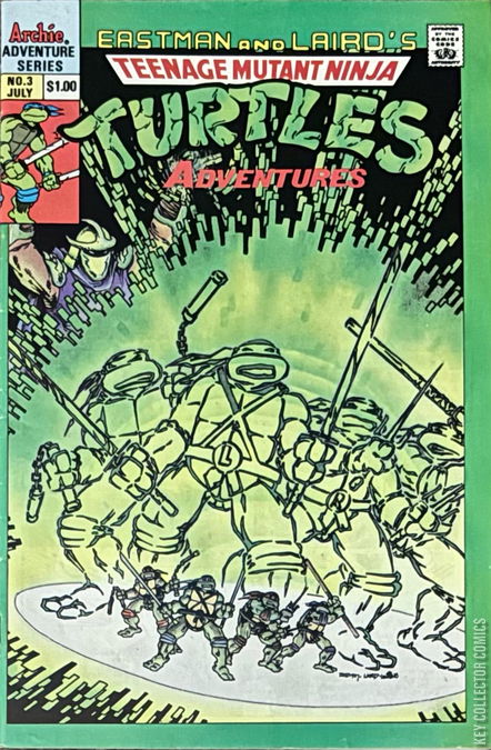 The Incredible Shrinking Turtles , part 1 : The Turtles are outside practicing in a park when a strange orb crashlands into a nearby pond. The TMNT dive into the water and rescue a strange looking alien from the sinking globe. The Shredder is watching the whole episode while concealed within the brush. The alien revives long enough to tell the Turtles that some sort of artifact called "The Eye of Sarnath" had seperated into 3 parts during the crash. If these sections were to be joined together, they could be a terrible power on the Earth. The alien then gives the TMNT a device called the Crystal Converger that will help them locate the fragments of the Eye. Shredder overhears this, and sets off to find the pieces before the TMNT can. The Turtles follow the path given to them by the Converger, which leads to a garbage barge. The Heroes in a Half-Shell hop into the drek to search for the Eye fragments. Don retrieves a section, but then Shredder shows up and takes it. As the TMNT prepare to fight for the fragment of the artifact, Shredder inadvertently activates its powers and shrinks the Turtle boys down to action figure size!� Shredder prepares to squash our heroes, but they manage to escape with the Converger and make it home to the sewer. Splinter calls April for help, and the pair head off in the Turtle Van to find Saki and get the fragment from him before he can do more harm. Shredder reports to Krang that the Turtles have been defeated, but the ornery alien demands proof... which Shredder does not have. Saki decides to start shrinking buildings all over the city...