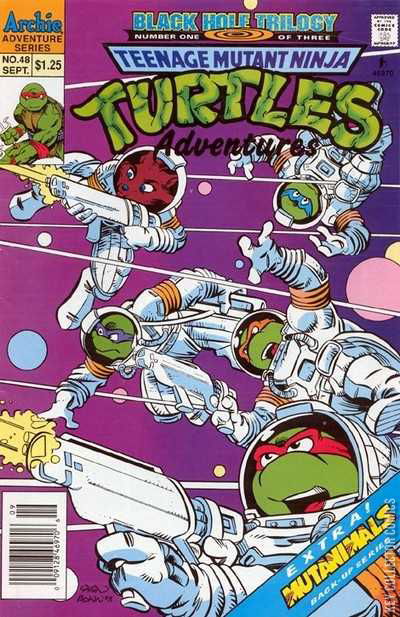 Out of the Blue (Into the Black)("The Black Hole Trilogy", Part 1): Sarnath's ship arrives in Dimension X near a Black Hole. As Don explains to everyone what a Black Hole is, their craft is suddenly attacked by Ki'Rec and his Imperial Aerwyl Fleet. Sarnath fights back and a space dogfight ensues. Everyone puts on pressurized space suits in case they need to abandon ship. Sarnath does well dispatching the attackers, but his ship takes heavy damage and is eventually destroyed. As the Turtles and Ninjara float in space, they see the wreckage of Sarnath's ship being pulled towards the Black Hole. Mikey screams to their friend to eject, but Sarnath states that there's no time to save both Qark and himself, and he jettisons an escape pod as his ship disappears into the Hole. The Turtles find themselves under attack from the remaining Imperials. Just as all seems lost, a strange ship arrives and destroys the attacking vessels. The pilot pulls alongside our heroes, explains that the ship belongs to the Nova Posse, and offers them a ride. Once on board, the TMNT met the rest of the Posse. The pilot is a gargoyle-like alien named Zebulon, who is accompanied by a humanoid woman named Trip, a blue woman named Luna Azul, a purple man named Rave and a four-armed bat-like woman named Exeen. Trip explains that the Black Hole they've just encountered didn't exist in that spot a mere six months ago - in fact, there wasn't even a star in that location that could have become a Black Hole. Donatello states that's impossible, and the Posse explains that not only is it possible, it's getting bigger and devouring everything in its path. The ship then comes upon Stump Asteroid, where a huge fleet of ships is circling (among them Cudley the Cowlick). The Posse land on the asteroid, where they're greeted by Stump and Sling. Luna tells the materialistic duo that the Posse is at their service. Much to Luna's surprise, Stump and Sling are far more excited to greet the Turtles and begin planning their next wrestling match. When the Turtles explain that they're not interested... Plus Mutanimals backup story "Megadeath", Part 1.