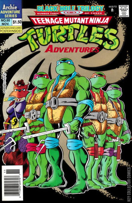Kill Them! (The Black Hole Trilogy", Part 3): plus Mutanimals backup story "Megadeath", Part 3. The battle between the Nova Posse and Mazool's troops intensifies. Our heroes are forced to retreat from the planetary base of their adversary and join the space combat near the Black Hole. Donatello continues to experience cosmic awareness with the help of the Turnstone when Sarnath states that he's been contacted by his companion Qark. Sarnath attempts to draw Don's attention away from the Stone, but Donatello punches his friend and states that he has no interest in Sarnath's "dog" as he's far too occupied being "one with the universe". Sarnath pleads with Don to remember where they are and to grasp what the Turnstone is doing to him and the universe beyond. Nova Posse's ship takes a direct hit that fries their control panel, preventing them from making contact with their allies. Since the Posse's craft is identical to those piloted by Mazool's forces, our heroes appear as enemies to their friends in the Stump armada. Sarnath surmises that Don is in control of the Stone and attacks him, trying to gain control of the powerful object. Sarnath manages to distract Don by getting him to focus on the peril that his brothers are in, and uses the opportunity to wrest the Turnstone from the Turtle's grasp. Sarnath states that he is far better suited for the task at hand. The multi-armed alien is instantly "plugged in" to universal awareness, and he states that it's time for Don to go, using the Turnstone's powers to teleport Don to the ship that his companions are aboard. Sarnath then faces the Sons of Silence and tells them that while they would have been able to control Donatello, they won't be able to control him. Sarnath states that "this must end" and a huge projection of the alien is seen in space, surrounding the Black Hole. Suddenly, dozens of spacecraft explode as their engines overload. Nova Posse is able to save their ship with quick action by their helmsman. Sarnath teleports the Sons of Silence away... and then the Black Hole collapses onto itself. On the planet below,...