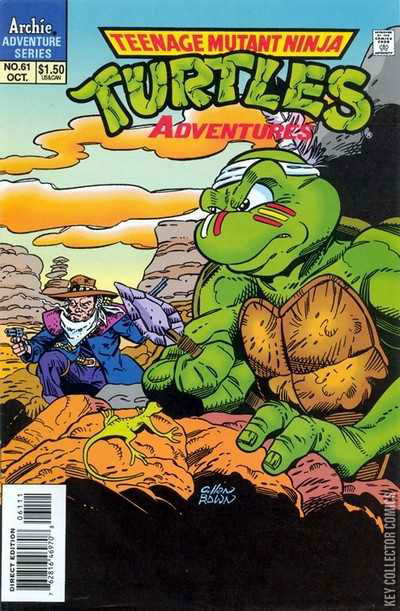 Once, Again, Always : The TMNT, Splinter, Ninjara, Candy Fine, Kid Terra and his friends gather in the desert to place a headstone for Slash, who sacrificed his life to save his friends and the planet Earth from the evil alien Maligna. Raph goes off to brood and Future Raph joins him. Raph asks what will become of Ninjara and him, but Future Raph refuses to give details. On cue, Ninjara arrives and three sit together as the sun sets. The others have built a fire and are seated around it when a portal opens up. Future Mike, Future Leo and April's future great granddaughter, Nobuko, jump through. Future Don and Future Raph are happy to see their future siblings (man, is this confusing or what?) Leo reveals that Nobuko is one of his students, and the girl gives April a big hug, thrilled with the chance to meet her ancestor. Future Don discovers that while their past has been altered, the future is unchanged - meaning that mankind brought on the flooding caused by global warming - and that the Mutanimals premature deaths were in vain. Kid Terra is shocked to hear that the Mutanimals were slain. Future Leo explains that in his past, it was Maligna who had killed the Mutanimals, surmising that their deaths were "their destiny... or something. "In the morning, Master Splinter and the janitor from last issue are doing their morning meditations and speaking to one another telepathically. The Future TMNT and Nobuko open a portal and go back to the future. The janitor then tells the Turtles the creation story he learned from his tribe, the story of how life began on the back of the gigantic Turtle Island.