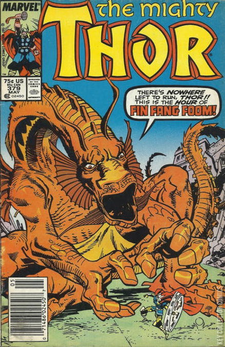 "There Were Giants In Those Days (Or, A Discourse Between Heroes and Villains)". With Asgard still under a mystical sleep, the Frost Giants seek to awaken the Midgard Serpent to fight Thor; The dragon who shows up, however, is Fin Fang Foom but after a brief battle with our hero, its duplicity is revealed and Thor faces down Jormungand. Appearances by Loki, Kurse, and Balder. Brief appearance by Iceman (of X-Factor).