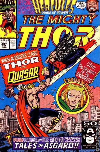 Hercules and Quasar guest star in "Clash With Quasar!" Script by Tom DeFalco, pencils by Ron Frenz, inks by Al Milgrom. Enchantress guest appearance. Karnilla, Balder, and Sif star in the "Tales of Asgard" back-up, "Now Begins...Sword Quest!"Quasar is contacted by Hercules who explains to Quasar that Thor has been enthralled by a "sinister alien force". Quasar doesn't quite believe it, but Hercules tells Quasar tells him to have faith. He then contacts Thor and says the same thing. While waiting for Hercules, Quasar is enchanted by the Enchantress. He agressively attacks Thor and fights him to a standstill, finally Thor accidentally frees Quasar by energizing the Quantum-Bands which have a protection against mental control. Enchantress retreats from the combined might of the three heroes. In light of Hercules' "elaborate deception", Thor and Quasar leave him tied to the lamp of the Statue of Liberty.