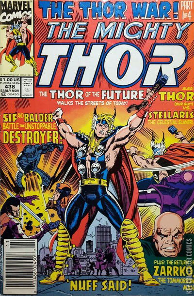 The future Thor (Dargo) returns in "The Thor War" part 1 of 4, "Yesterday Must Die!" Script by Tom DeFalco, pencils by Ron Frenz, inks by Al Milgrom. Stellaris appearance. Sif and Balder star in the "Tales of Asgard" back-up, "The Hel-Hounds and the Heroes."