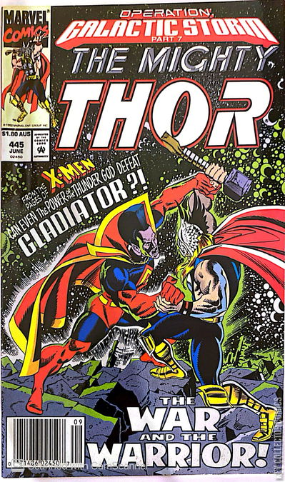 Operation: Galactic Storm, Part 7Immediately after exiting the stargate, the Avengers envoy to the Shi'ar get caught up in a firefight between a Kree starfighter and a remote Shi'ar planet. Intercepting the planet's distress beacon to the throneworld, Gladiator attacks the Avengers, assuming they are in league with the Kree. While Thor and Gladiator duel and debate the morality of war and the role of warriors, Captain Marvel and Living Lightning discover a Skrull aboard the Kree starfighter. Using morally questionable methods to overcome Gladiator, Thor starts to become the irresponsible, duty-driven monster he initially detested in Gladiator. The Avengers prevent him from killing Gladiator, but Thor impulsively sends his opponent through the Shi'ar stargate, sealing it permanently with his Uru hammer. En route to the Shi'ar homeworld, the stranded Avengers are suddenly intercepted by a flight of Shi'ar starcraft.