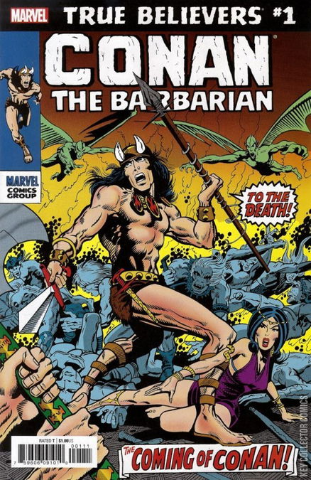 Come with us to the HYBORIAN AGE. That is the first words to this comic. We see Our hero/barbarian on the splash page sword in hand and a lovely blonde sitting near his left knee.We start in summer in Vanaheim. A battle is being waged by raiding Aesirs with the defending Vanirs and of course Conan is in the middle of this too. He is in his youth at this time and he sees an Aesir being attacked and here he decides that it is not to do with him because he has earned his gold. But why let 3 jackels live? His response, By Crom they should not and by crom they shall not. You know what happens next. He takes a swipe with his sword and kills 2 helping Olav of Aesgaard. The Vanirs flee leaving Conan and his party some time to heal wounds and bury the dead ones.Olav talks strategy with Conan and why he joined his side. Meanwhile the retreating Vanirs are left to their own accord. The leader Volff and his aide Hothar leave the rest to be slaughtered and run into a cave with glowing green light and an old man and young girl inside the old man has been waiting for the surprised duo.They are very leary and the old man introduces himself as Sharkosh the Shaman and tells them not to fear him. As they listen to him a green jewel he calles a star stone has told him of their coming and it is in need of a young warrior and they believe it is Conan and also concers the handmaiden by Sharkosh's side. They agree and Sharkosh utters a spell and the jewel starts to light up brighter. Meanwhile Conan and Olav and crew attack the Vanir camp. But the attackers see a demon horde crew in the sky. The trio attack both groups with one of the demons killing poor Olav. So of course Conan attacks the creature to avenge his fallen leader. Only he is swooped up and then dropped onto a snow piled peak and the Cimmerian is knocked out cold.An eternity later he finally wakes...