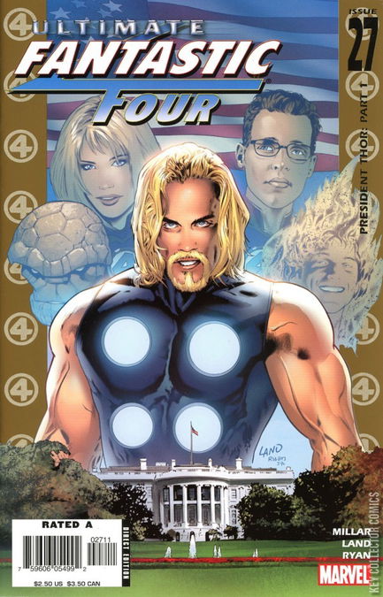 PRESIDENT THOR PART 1 In the Nevada desert Reed Richards meets his future self of 24 hours where the Fantastic Four have decided to change time by making sure the accident that gave them their powers never happened, and more importantly never changed Ben Grimm into The Thing. When he returns to the Baxter Building Reed converses with Sue Storm whom is on an archaeological trip with Jean Grey and Kitty Pride of the X-Men. She decides it would be too risky to change time just for the sake of Ben's looks. John Storm mean while is getting a recipe for beer from the zombified Reed Richards who are still in containment. Zombie Reed warns Johnny that their escape is only a week away. Outside on the streets if New York Ben Grimm is in trouble with the NYPD after smashing an undercover police car believing it to be a getaway car. Ben Grimm is on his way to Johnny Storm's birthday party who has tricked Ben into think it is a costume party causing his spirit to break. When Johnny catches up with Ben he reveals that he believes Reed has forgotten about him and will be stuck as The Thing forever. He confided on how he has contemplated suicide only to be halted by his rocky skin. In the end he questions if Reed would help kill him. This is the what changes the minds of the Fantastic Four to alter history. Reed finished his time portal and the events from the beginning are witnessed again. The Fantastic Four alter history, just as a "Skrull" appears claiming he is "too late". In the New World, Reed Richards is Vice President of the USA to Thor. Instead of an accident giving powers the Fantastic Four made first contacts with the Skrull alien race who are planning to visit Earth. In this new world there is no poverty and virtually no crime. In addition to this every man, woman and child on the planet has super powers.