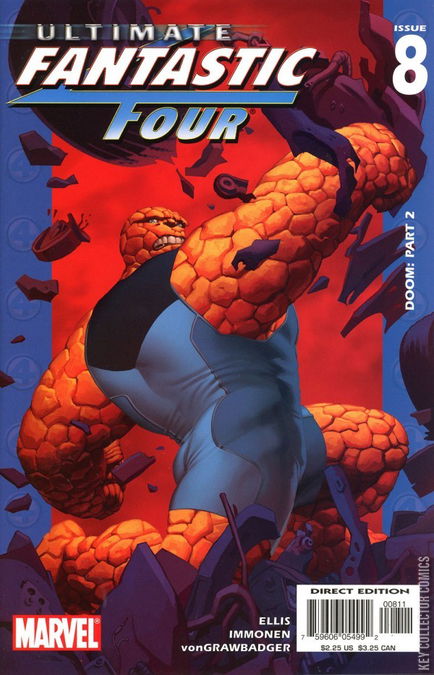 DOOM PART 2 Doom has set up a "Free Zone" in Denmark for his followers. Doom has been transformed into a being of metal with cloven hooves. He releases a swarm of insect drones into the air as some of his followers look on. At the Baxter Building, Reed and Sue examine a somewhat reluctant Ben Grimm. Ben is still under quarantine and exhibits his tremendous strength in tests. Johnny has gone on a date in Manhattan under the protection of a security detail. Johnny sees the insect drones attack and enter the Baxter Building. Johnny "flames on" to help. As Johnny enters the fray, Reed is about to be impaled through the eyes by one of the insect drones.