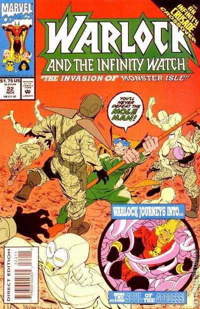"Siege!" The United Nations has invaded Monster Island under the orders of Senator Munson. The leader, Capt. Sylvester Hammer is met by the Mole Man. The captain tries to tell the Mole Man that this is no longer his island. But Mole Man responds by awakening one of the giant monsters that give the island it's name. The troops have brought weaponry ready for the Infinity Watch, but not something as large as what they face now. Mole Man then unleashes an army of Moloids armed with clubs. Mole Man brings the men back to their ship after he has clothes his Moloids with their uniforms.Meanwhile, Warlock has traveled to the Goddess' subconscious and tries to bend the Goddess' will with his own spirit. She proves too powerful, her power augmented by the Cosmic Egg. Mole Man arrives back on sure and he and the Moloids notice the Sun is growing bigger. It soon engulfs them, having gone nova.