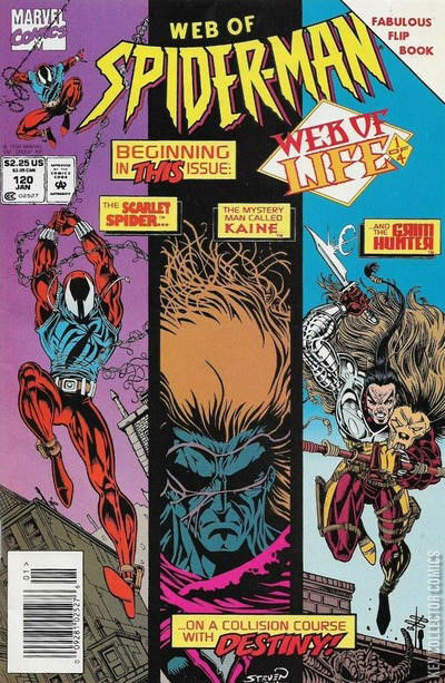 WEB OF LIFE PART 1 - LURE OF THE SPIDER Learning that the mobster known as Tombstone has broken out of prison, the Scarlet Spider has followed the killer to Wall Street. There the pair fight atop an armored car that Tombstone is attempting to rob. During the fight, the Spider dodges one of Tombstone's blows, causing the villain's fist to go through the roof of the armored truck, striking the driver and knocking him out. With the vehicle speeding toward a nearby café, the Scarlet Spider ignores Tombstone to leap in front of the armored car. Webbing up cushions onto his arms, the wall-crawler braces himself and prevents the van from crashing into the building. Tombstone leaps down to face the Spider and is struck across the fact wit a lamp post. Although Tombstone tries to shrug off this blow, he blacks out and falls to the ground, much to the Scarlet Spider's relief. As a crowd gathers to congratulate the masked hero, he is unaware that a mysterious figure watches him from the shadows. Meanwhile, at the Kravinoff Estate, Vladimir Kravinoff continues on his research of Spider-Man in order to learn all the heroes secrets so he can avenge the death of his father. After putting on his armor and testing his weapons, the Grim Hunter is ready to begin stalking the city. Later, aboard the USS Intrepid, the Scarlet Spider clashes with members of the ARES terrorist organization. As the Spider takes down the terrorists, Daily Bugle reporters Betty Brant and Ken Ellis argue over who is going to score the byline on this story. After wrapping up the ARES soldiers, the Scarlet Spider swings away. As he does, his eyes meet those of Betty Brant, and at first he thinks that she is looking at him with recognition, but decides that isn't it. This also get him wondering where the real Spider-Man is. He figures the Peter Parker is off somewhere with his wife Mary Jane, unaware that the wall-crawler is passed out on the roof of a building fighting for his life. Meanwhile, Kaine observes the hospital where Aunt May is being treated after suffering a stroke and entering a coma. His watchful observation is suddenly interrupted by one of his cognitive flashes. Once again he sees a vision of Mary Jane being murdered by an unknown assailant. Realizing that this will happen sometime soon he rushes out to prevent it from happening. However, Mary Jane is far from danger, at least for the time being. This is because she has just arrived at the Pittsburgh airport. There she meets with her sister Gayle whom she hopes to reconnect with during her current family crisis. While back in New York, Ben Reilly has taken a break atop the Empire State Building. After his encounters with Tombstone and ARES he feels confident about his new costumed identity although he doesn't like the Scarlet Spider moniker that the Daily Bugle has labeled him with. Although he doesn't want to mess around with Peter Parker's life, Ben is looking forward to beginning his own career as the Scarlet Spider. At that moment, the Grim Hunter arrives aboard the USS Intrepid where military police are cleaning up after the Scarlet Spider's battle ARES. Thinking he is tracking Spider-Man, he slaughters the soldiers and continues tracking the wall-crawler. While at the apartment of Betty Brant, the Scarlet Spider pays a her a visit to give an interview in the hopes of setting the record straight. At first, it appears the pair are about to get intimate, Betty pushes the wall-crawler back, telling him that she is working on her objectivity. After she sends the Spider away, she is visited by the Grim Hunter who demands to know where the Spider has gone. Not far away, the Scarlet Spider wonders if there was a spark between him and Betty, but wonders what they could mean, unaware that the Grim Hunter is stalking him.