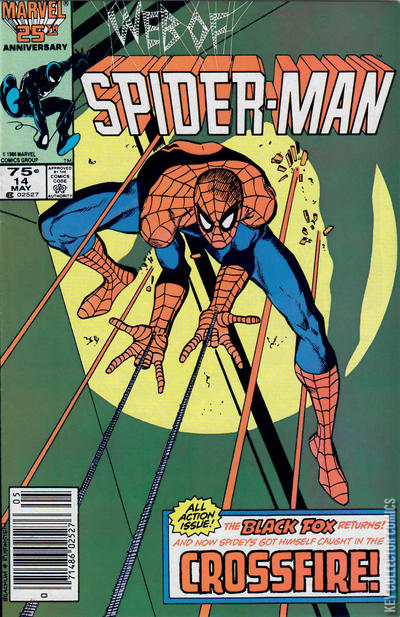 ALL THAT GLITTERS Peter Parker's landlady, Maimie Muggins, has come to his door with a copy of their lease agreement. Telling him that if he doesn't fix the fire damage done to his apartment in the next two days, she will have him evicted. Peter tries to tell her that he wasn't responsible for the damage done, but Muggins refuses to accept this excuse, telling him that repairs are his responsibility. Muggins hopes that she can finally be rid of Peter, especially after he was responsible for a vigilante movement in the neighborhood. Left with his thoughts, Peter thinks about all of the bad luck he has been having recently. Particularly the fact that his Aunt May's fiancee Nathan Lubensky is in the hospital after a beating that Peter could have prevented, and his trouble selling photos at the Daily Bugle. As he paces around his apartment, Peter kicks the golden notebook that he recovered from a building that the Beyonder had recently turned into gold. Peter considers the value of this notebook and that selling it could put him on easy street. Suddenly, Peter realizes what time it is and that he is late to meet Aunt May at Nathan Lubensky's hospital room. As he begins changing into his black-and-white costume, Peter realizes that it smells pretty ripe. After a quick shower, he puts on his classic red-and-blue outfit even though it still smells smokey after the fire. Elsewhere, the Black Fox is walking down a street and leaps up onto a rooftop. He almost slips, realizing that he is getting too old for these sorts of stunts. Still, he climbs up onto the upper level of the building and deactivates the security alarm on a nearby window. Going inside, he greets his old friend and fence Andre Boullion to celebrate his recent release from police custody. The two toast the Black Fox's upcoming heist, but Andre explains that he can't help him fence it as the police will be monitoring his activities for the next few months. Thinking to himself, this complicates the Black Fox's plans, and he hopes that he can convince Bullion to make an exception in this case. By this time, Peter arrives at the hospital and learns from Aunt May and Mary Jane that he just missed visiting hours. May tells Peter not to worry about it since Nathan is expected to return home the following day. When Peter apologizes to Nathan for being late, he gets a cold reception from his aunt's fiancée. Peter feels bad because Nathan feels that he is neglecting his Aunt May, and this just proves his point. On their way out, Aunt May tells Peter and Mary Jane that Nathan's health insurance is refusing to pay his hospital expenses because of the suspicious nature of his injuries. She then tells the pair that she and Nathan are too proud to accept any charity from them and leaves. Peter is hurt by his Aunt's inability to ask for help and decides that he needs to get some money fast. To this end, Peter goes to the Daily Bugle building to see if there are any assignments available for him. When he arrives it is in the middle of an argument between J. Jonah Jameson and Joe Robertson.[Continuity 6] When Peter tries to talk to Jonah, Jameson tells him to leave him alone. Peter learns from Joe that Jonah might be missing his old job and may be trying to get it back. That's when Parker asks Joe if he can get an advance for photos because he is strapped for cash. However, before Joe can authorize this, Kate Cushing interrupts telling them that as city editor, all vouchers need to go through her. She tells Peter that his work is sporadic and inconsistent in quality, and as such, she can't authorize an advance. As Peter heads home, he once more thinks about the golden notebook, but can't think of a way of selling it that wouldn't raise attention or be illegal. That evening, at the Carnelian Embassy, guards on the roof are distracted when a teddy bear is tossed onto the roof. Dismissing this as a non-threat, the guards are surprised when the teddy bear suddenly explodes spraying them with taser darts that knock them out. With the guards down, the Black Fox gets to work to steal a jewel called the Eye of Carnelia. Shortly thereafter, Spider-Man is swinging by looking for crimes to photograph. Spotting the knocked out guards, Spider-Man goes to investigate and discovers the Black Fox committing a robbery. Spider-Man is upset that the Black Fox played him for a dupe the last time they met and decides to stop him. However, before Spider-Man can swoop in and stop him, the Black Fox is interrupted by more guards. As the Black Fox blinds the guards with some smoke bombs, the wall-crawler leaps down to try and stop the thief. In the hopes of getting action photos for the Bugle, the web-slinger knocks out the guards. Moments later, soldiers enter the room, and Spider-Man realizes that he is in an embassy. As he fights off the soldiers, Spider-Man regrets trying to sensationalize the battle for money, as he is on the verge of creating an international incident. With bullets flying, the Fox decides to get out before he is shot and leaps out of the skylight. Spider-Man follows shortly thereafter, intending to sell his photos to the Bugle after he captures the Black Fox. However, he realizing that he has nothing worth selling because of all the smoke and that any clear photos would show Spider-Man fighting the authorities. Witnessing the Black Fox change into his civies in an alley, he overhears him talk about bringing the stolen gem to his fence. Intrigued by this, Spider-Man tags the Black Fox with a spider-tracer and returns to his apartment. There, he recovers his golden notebook and swings back out into the city. Even though Spider-Man struggles with the ethics of what he is planning on doing, he realizes that he doesn't have much choice. Tracking the Black Fox, the wall-crawler witnesses him leaping out of the window of Andre Boullion. As Spider-Man approaches the window his spider-sense begins to go off, but he ignores it since the Black Fox is fleeing. E