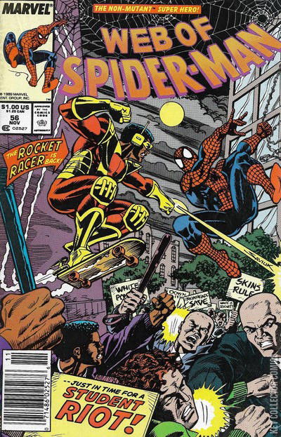 SKIN-DEEP Peter Parker is working on a new web-fluid formula at Professor Edwin Swann's lab at Empire State University. The fluid makes a squishing sound instead of the trademark "thwip". Suddenly, the fluid begins to eat through the plexiglass that he sprayed upon it. This, like his last formula, turns out to be a dud. Suddenly, Peter's spider-sense goes off, and he quickly hides his work, leaving a flask of the new formula on a shelf. However, the warning isn't about someone about to walk in on him, but of some kind of commotion going on outside. Looking out the window, Peter is horrified to see a group of white supremacists burning a cross on the lawn of the quad to protest the opening of a Hall of Afro-American Studies. Peter quickly puts on his Spider-Man costume to get photos for the Daily Bugle and diffuse the scene before it gets violent. The leader of the skinheads is a young man with a Swastika tattoo on his cheek named Eddie the Cross. Eddie begins inflaming the witnesses with his racist rhetoric. Just as Spider-Man is arriving on the scene, he witnesses the Rocket Racer arriving on the scene. Thinking that the Racer is going to get into trouble, Spider-Man tries to stop him. Eddie and his gang think Spider-Man is endorsing them and tells the wall-crawler that they will handle the Rocket Racer. However, Spider-Man explains that there will be no violence, wanting to stop it before someone gets hurt. However, the Rocket Racer is not willing to stand down while there are white supremacists on campus and mentally commands his rocket-powered skateboard to come to his aid. His spider-sense going off, the wall-crawler dodges the skateboard but has to let the Racer go to do so. This allows the Rocket Racer to attack Eddie the Cross, who begins to cower as soon as the tables start to turn. Recovering, Spider-Man stops the Racer from attacking the skinhead and pulls him away as the police arrive on the scene. As they arrest Eddie the Cross and his goon squad. One of the officers remembers Eddie when he was arrested at a Watchdogs rally. As he is being taken away, Eddie the Cross vows to get revenge against Spider-Man, considering him a race traitor because he helped out a black man. Upon the rooftop, Spider-Man asks the Rocket Racer why he went after the Neo-Nazis so blindly. Robert explains that this day was supposed to be the best day of his life. Having reformed and deciding to go back to school, he brought his entire family with him on the day he registered to attend Empire State University. His mother was proud of Robert until their day was marred when the Farrell family were harassed by Eddie and his gang of skinheads. When Robert tried to defend his family he was swarmed by the gang. When others come to break up the fight, the skinheads fled the scene and Robert vowed to get back at them later as the Rocket Racer. Back at the apartment, he shared with his family, Robert recovered his Rocket Racer costume from his closet and went after Eddie and his friends. In the aftermath, the Rocket Racer realizes that he was just as hot-headed as when he was a criminal and isn't sure what he hates more, himself for the way he behaved or Eddie the Cross and his thugs. Spider-Man tells Robert to go easy on himself as people make mistakes. Spider-Man gets the Rocket Racer to promise to let the police deal with the problems, however, after Spider-Man leaves, Robert vows to do something if the police fail to do their job. On his way home, the web-slinger wonders why Eddie the Cross and his Neo-Nazis chose to protest at Empire State University but decides to put it out of his mind for the night. Meanwhile, Mary Jane is out partying with some of her friends in the modeling industry. She asks them what direction she should take with her career. One of her friends suggests that Mary Jane audition for a role in a popular TV soap opera. Mary Jane actually begins to consider the idea of as a possibility. At that moment, Peter Parker has returned home to his Aunt May's house. Removing his Spider-Man mask, he notices that his bruises suffered during his battle with Tombstone are starting to fade. As he goes downstairs, he finds the place feels empty now that Mary Jane's cousin Kristy is in the hospital getting help for her eating disorder. The only person that is home is Nathan Lubenski. Asking Nathan if he wants to play Scrabble, but Nathan isn't up for it. In a depressive mood, he tells Peter that life is too short and he wishes May was home as everyone should spend as much time with their loved ones. Sitting on the couch, Peter glumly thinks about how he recently learned that Nathan is suffering from heart failure and his days are numbered. This gets Peter thinking of the death of his Uncle Ben years earlier since then he always figured his Aunt May was on the verge of death but she kept on going. Looking at the newspaper just makes him think of more of his recent problems. Particularly Joe Robertson's arrest and apparent demise fleeing prison with Tombstone, and how Glory Grant shot her lover, the mobster known as Eduardo Lobo when she was actually aiming to Spider-Man. He thinks about how these stories got front page news, while his Uncle Ben only had a mention in the obituaries. Peter then receives a phone call from Harry Osborn, Harry has called to confirm if Peter and Mary Jane are still going to help the Osborns move into their new home. He also tells Peter that he has a surprise in store for them. Peter confirms that he will be there, and after he hangs up he is so exhausted that he falls asleep on the couch. When he wakes up in the morning he finds Mary Jane curled up with him on the couch. They are woken up by Aunt May who has prepared breakfast for the couple. Later, when Peter arrives at Empire State University the police is quelling another riot caused by Eddie the Cross and his gang. Among the people watching is Robert Farrel. When Peter goes up to him, he comments on how horrible the situa