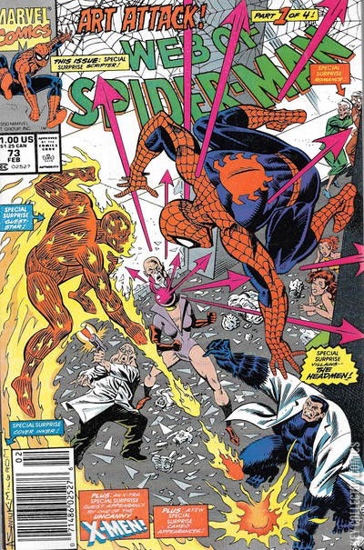ART ATTACK! PART 1 - HEAD QUEST Peter Parker and his wife Mary Jane, and her cousin Kristy are invited along with Aunt May and her new boyfriend, Willie Lumpkin to to attend the opening of an art exhibit. On the cab ride there, everyone is being entertained by Willie Lumpkin's ability to wiggle his ears. Although Peter is having a good time, his stomach is upset after eating Willie's lasagna for supper. Soon they arrive at the art gallery in Greenwich Village. There they discover that the exhibit is that of Alicia Masters, a long time associate of the Fantastic Four, who Willie had gotten to know during his stint as their mailman. Willie invites everyone to have a look around. When Mary Jane swoons over Alicia's husband the Human Torch, Peter brushes him off as not such a big deal. Everyone is even more star-struck when Namor the Sub-Mariner arrives with his date Carrie Alexander. Namor's presence even gives pause to the gallery's celebrity guests. Going to get refreshments, Peter bumps into Johnny Storm, the Human Torch, and the pair exchange insults about the pair riding on the coattails of their respective spouses. Outside of the art gallery the Headmen wait inside their van waiting to see if Spider-Man will arrive on the scene. The disembodied head of Chondu the Mystic is impatient to get started, not wanting to be subject to one of Arthur Nagan's insane schemes. This time, Chondu wants to obtain Spider-Man's body for himself, in the hopes of getting a powerful and youthful bodies. Jerold Morgan uses a bio-scanner to zero in on Spider-Man's location. Pinpointing the location at the nearby art gallery they drive off. They pass by a young artist named Peter Nicholas, who is having trouble finding the location of the gallery himself. Back inside the gallery, Peter Parker is still not feeling well. When Willie goes to introduce his friends to Johnny Storm and Alicia Masters, Peter excuses himself to go to the washroom. However, before he can get there, his spider-sense begins to go off. He manages to push Mary Jane out of the way as one of the show windows of the gallery explodes inward. In order to protect the other patrons, the Torch uses his flame powers to incinerate the glass. As Peter and Johnny begin ushering people to safety, Arthur Nagan leaps into the room and demands that the Human Torch turn over Spider-Man. Signaling Mary Jane to get May and the others to safety, Peter slips away into the ventilation shafts so he can change into Spider-Man. While back in the gallery, Nagan keeps the Human Torch at bay by taking a hostage. The hero still tries to stop Nagan, but is attacked from behind by Ruby Thursday who enters the room carrying the head of Chondu. Not far behind here is Jerry Morgan, rounding up the entire Headmen. That's when Spider-Man comes swinging in and ambushes the Headmen. While the others are busy trying to subdue the wall-crawler, Jerry Morgan tries to shoot the hero with a tranquilizer gun. However, before he can pull the trigger, the Human Torch blasts the gun out of his hands. While Spider-Man and the Torch are busy containing Nagan and Morgan, they are too busy trading quips to see Ruby Thursday fire a number of plasma darts from her synthetic head. The pair dodge the bolts, and when Nagan tries to attack Alicia, Spider-Man swings in to her rescue. She reciognizes his voice as that of Peter Parker, and in order to keep his identity a secret, Peter ushers Alicia toward Mary Jane so his wife can get the Masters woman to safety. Spider-Man's attempt to get Alicia to safety is seen by the Headmen and the Human Torch. The Torch thinks that the wall-cralwer is grandstanding for Johnny's wife and does the same thing with Mary Jane. It's then that Peter Nicholas arrives at the gallery. Seeing the battle that is raging, he wishes there was something he could do, but does not know what. As the battle between the two costumed heroes and the Headmen rage on, Nicholas spots Kristy Watson in trouble. Spider-Man tells Peter to get her to safety. Hearing Kristy's name, Nicholas mistakens it for "Kitty" and is briefly confused. Ultimately, the battle turns when Spider-Man grabs Arthur Nagan and tosses him into his teammates. With the Headmen bowled over, Spider-Man webs them up. With the Human Torch taking control of the situation, Spider-Man takes the opportunity to leave in order to change back into Peter Parker. In the aftermath of the battle, Peter Nicholas has vanished, but not before Kristy has developed a crush. As the authorities arrive on the scene, Peter has finished changing and makes a rush to the washroom to finally deal with the food poisoning he had been struggling with the entire night.