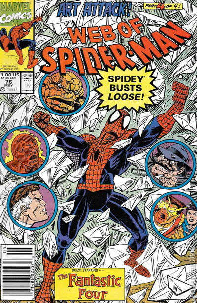 ART ATTACK! PART 4 - ART'S DESIRE! Thanks to the combined powers of the group of criminal artists known as Avant Guard, Spider-Man has been frozen solid thanks to a freak blizzard striking Times Square. As Spider-Man struggles to get free, he thinks about the events that led him to this moment. Convinced that Spider-Man is doomed, the Painter uses his magic paints to create a floating disc to take himself and his allies away. As soon as they are gone, Spider-Man manages to break free from the ice. As he recovers from his ordeal, the wall-crawler is joined by the Human Torch who is out collecting storm data for Mister Fantastic. Spider-Man asks to be taken to the Fantastic Four's headquarters so he can provide information regarding the source of the blizzard. By this point, the Painter, Bora, and Spark return to their loft to discover that the Painter's painting of Spider-Man frozen in ice is beginning to change. Instead of a painting of Spider-Man trapped in ice, it turns into a painting of the wall-crawler talking to the Human Torch. When Bora and Spark criticize the Painter, he threatens them, telling him this is merely a work in progress. As the mystically created blizzard continues to pound Manhattan, Mary Jane continues to try and keep the minds of her cast members off the danger outside. Unfortunately, her efforts were dashed when the power suddenly goes off. While at the Four Freedoms Plaza, Mister Fantastic keeps Captain America up to date on the Fantastic Four's efforts to end the crisis. Elsewhere in the city, Quasar is out assisting ambulances to get people to hospitals. At that moment, Mister Fantastic and the Thing head out with a device that will allow Reed to examine the weather patterns. Watching these developments are the Avant Guard, thanks to the Painter's paintings. Suddenly, Spark's powers manifest themselves on his own, a sign of their ascension to greater power. They then turn their attention to Spider-Man and the Human Torch. Spider-Man is tracking the Avant Guard thanks to the spider-tracer he tagged Bora with during his battle. Telling the Torch who about their leader, the Painter, the Human Torch remembers him as they had fought early on in his career. Explaining how the Painter claimed to have obtained mystical paints from aliens that allowed him to make his paintings come to life. However, in light of recent events, the Torch is left questioning the validity of this story. Crashing into the Avant Guard's hideout, the two heroes clash with Spark and Bora. Although Bora snuffs out the Torch's flames, she is quickly wrapped up by Spider-Man's webbing. This leaves him open to attack from Spark. However, the Torch recovers and uses his powers to overheat Spark, causing him to pass out and revert back to his normal form. That's when the Painter uses his paints to revive his foes. Despite this, Spider-Man and the Torch insist that they will keep fighting no matter what. This prompts the Painter to order his allies to surrender. When Spark and Bora refuse to follow orders, the Painter makes them disappear with a wave of his brush. Before the two heroes can apprehend the Painter, he surprises them when his body suddenly swells until it bursts, showing the room with cockroaches. Protecting themselves from the flurry of bugs, Spider-Man looks over the remains of the Painter and discovers that it is nothing more than canvas. Upset that the Painter escaped, Spider-Man's attention is turned to a painting that the Torch has found. They are find that it contains both Spark and Bora, apparently trapped within. With the crisis over, the blizzard ends and the snow beings to melt.
