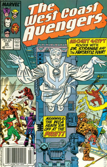 "Lost in Space-Time, Part 6: The Time of Sands!" Guest-starring Moon Knight, Doctor Strange, Ghost Rider (original), Firebird, Two Gun Kid, Rawhide Kid, and the Fantastic Four. The West Coast Avengers encounter the Fantastic Four in the ancient Egypt of Rama Tut. But when the Fantastic Four fail to recognize them, Hawkeye and his teammates finds themselves trying to uncover a mystery wrapped in a fateful enigma.