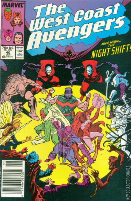 Night Shift decides the only way they can bust their friend, Digger, out of jail is to exchange him for some hostages. And the object of their hostage hunt is the West Coast Avengers!SummaryMockingbird witnesses Digger burying three crooks up to their necks in a street, and she goes into action, stunning the shovel-wielding ghoul. She takes Digger and his three near-victims to a nearby police precinct. Gypsy Moth brings news of Digger's arrest to her teammates in Night Shift, and they agree to attack the West Coast Avengers in retaliation. They invade the compound, making hostages of the hired help, while Hawkeye and Vision respond to the alarms. Gypsy Moth levitates the archer by his costume, while the Vision struggles against the Werewolf and the Misfit.Meanwhile, Mockingbird is picked up by fellow former Avengers Moon Knight and Tigra. When Moon Knight hears about Digger, he recalls his recent encounter with Night Shift and pilots the helicopter toward the Shroud's lair, the Tower of Shadows. There, after dodging Shroud's booby traps, they reach Night Shift's meeting room and find a note for the Shroud telling of their intent to face the Avengers. Saying that Hawkeye and the rest can handle themselves, Mockingbird decides they will stay put until the Shroud shows.At the Avengers' compound, the Scarlet Witch has joined the fray, but fares no better than her teammates, and the heroes are immobilized. Unaware of Mockingbird's activities, Hawkeye has no information for Night Shift regarding Digger. At that moment, Wonder Man arrives to turn the tide in favor of the Avengers. Freeing his teammates, they overcome the Night Shift.At the Tower, Shroud returns, and eavesdrops on the former Avengers' conversation. Warning them to leave, he teleports to the Avengers' compound where he spreads his darkness. Calling out an escape tactic, the Night Shift disappear in the dark as Shroud teleports them home.Later, on a cliff near the compound Hawkeye secretly meets the Shroud to...