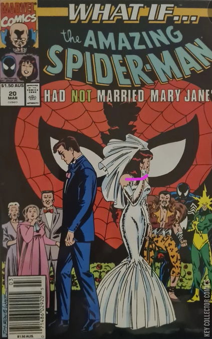 What If Spider-Man Had Not Married Mary Jane Watson? - Script by Danny Fingeroth, pencils by Jim Valentino, inks by Chris Ivy. Appearances by the Black Cat, Kraven, and Venom. Brief Silver Sable appearance. Green Goblin cameo. Peter abandons his betrothed at the altar, goes to work for Silver Sable, and reignites an old flame that is the Black Cat! Plus, two 1-page back-ups: "What If Spider-Man Had a Son?" Script and art by Darren Auck. "What If Ghost Rider Hit a Puddle?" Script by John Lewie, art by Armando Gil. Also, two half-page Daredevil and Sub-Mariner cartoons by Dutter/Auck/McLauren and Gary Fields/Keith Wilson. Letter to the editor from Charles Novinskie (Topps Comics). Cover by Valentino, Ron Frenz (?), and Bob Wiacek.