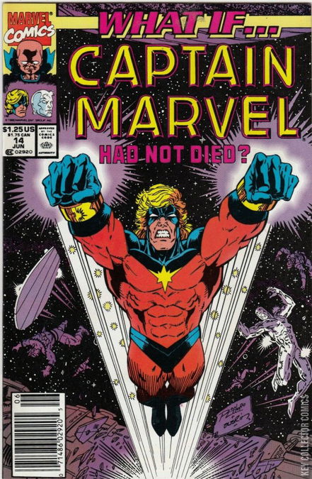 What if Captain Marvel Had Not Died? - Script by Steve C. Ringgenberg (script and co-plot) and M.J. Jorgensen (co-plot), pencils by M.J. Jorgensen, inks by Ian Akin and Brian Garvey. Cover pencils by Ron Lim, inks by Terry Austin. Captain Marvel decided to get tests done after his exposure. He discovered that he had cancer. He went to Reed Richards, Dr. Strange, and Dr. Blake. After making sure that Rick doesn't have cancer, the three doctors went to work. Dr. Strange decided to take everyone to another dimension where they can safely take off the nega bands and work on curing the cancer. This dimension keeps time still so they can work for years and no time would pass on Earth or for either one of them. After Captain Marvel is finally cured, he decided to work on stopping war between the Kree and the Skrull. While he was away, Silver Surfer felt a strange amount of bad energies starting to creep around the Earth and the universe. He felt helpless since he's trapped on Earth. So, he went to the Fantastic Four only to discover that the team has the same cancer that Captain Marvel has and it's contagious. Dr. Strange and Dr. Blake are also sick and they managed to get Silver Surfer off of Earth so that he can go and get Captain Marvel so they can find a cure. Silver Surfer traveled through the galaxy and found the Kree only they are dying from the plague. They thought it was the work of the Skrull but Silver Surfer is convinced that it was Captain Marvel. On Earth, Ben Grimm died from the cancer and Reed mourned him. Then, he realized that Rick was still perfectly healthy and so he did tests on the human. Silver Surfer found Captain Marvel and his beloved, Elysius, fighting the Skrull and the Kree and tried to get him to listen to reason. They fought until Silver Surfer forced him to use his cosmic awareness on Elysius. Captain Marvel discovered that he is causing innocent people to die from his disease. He went back to Earth and found that Rick had antibodies to help the humans and Elysius. Unfortunately, it won't work on the aliens. Captain Marvel decided to have Dr. Strange send him to another dimension where he won't cause any more deaths. Elysius went with him to eternal exile. With the plague gone, people kept on going on Earth with the Fantastic Four getting a new member. Ironically, Captain Marvel's plague killed so many Kree and Skrull that there was some peace between the races. Silver Surfer went to Galactus to accept his punishment for leaving Earth only for Galactus to just forgive him. No one really knows why.
