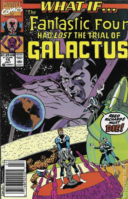 "What If the Trial of Galactus Had Ended in Reed Richards' Execution?" - Script by Roy Thomas, co-plot by R.J.M. Lofficier, pencils by Greg Capullo, inks by Sam DeLa Rosa. During an attack on the Earth by Galactus, he was defeated when Dr. Strange confronted him with the ghosts of all the beings slain on the worlds he devoured. He would have died had Reed Richards not intervened and spared his life. Galactus would then go on to destroy the Skrull Throneworld, leading to Reed's abduction into deep space and placement before a council made up of survivors of the worlds Galactus destroyed to stand trial. Reed's life was spared when Galactus made an appearance out of gratitude and brought along the cosmic entity known as Eternity to explain Galactus' role in existence. But, in this reality, Galactus does no such thing... Plot Without Galactus' appeal to sway the verdict of the council, Reed Richards was sentenced to death and executed immediately by Empress Lilandra of the Shi'ar Empire. The rest of the Fantastic Four, brought to observe the proceedings by Uatu the Watcher, were set to get revenge for their slain comrade when Uatu quickly transports them back to Earth. A few million light-years distance was not enough to quell their bloodlust, and the FF commandeered a Skrull saucer they had impounded on a previous adventure as well as Annihilus' Cosmic Control Rod. They took off for the Shi'ar Throneworld for their vengeance. Meanwhile, Gladiator of the Shi'ar imperial guard was questioning Lilandra's decision, earning him an indefinite leave of absence from the planet. As his shuttle took off, Lilandra was alerted to the FF's ship entering their space. A ship flies out to meet them, but is quickly dispatched by the Human Torch while the Invisible Woman protected their own ship with her force fields. Suddenly, the odds did not look in their favor as a good number of the Imperial Guard entered the fray. Sue took the Control Rod and placed it within the saucer's weapon systems. The combination created a blast so powerful it completely obliterated the Shi'ar planet. The FF return home, more depressed than when they left. Now not only have they...