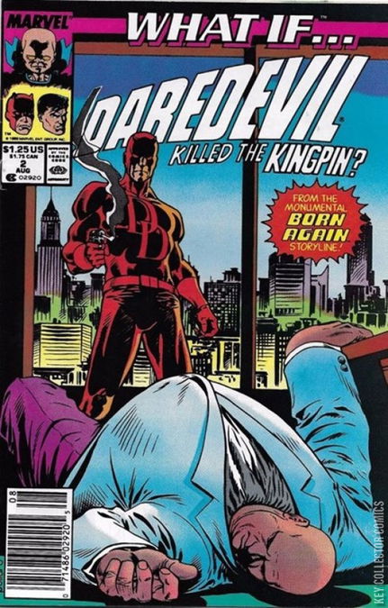 Cover art by Keith Pollard. What If Daredevil Had Killed the Kingpin?, script by Danny Fingeroth, pencils by Greg Capullo, inks by Ian Akin and Brian Garvey; After the Kingpin ruins his life, Matt kills him; Having a psychotic break after the murder, Matt shows up on the doorstep of Richard Fisk to let the Kingpin's son pass judgment on him; Hobgoblin and his goons interrupt the confrontation and both Matt and Ned are killed in the battle; Richard gives up being the Rose and dons a more familiar crime-fighting costume. Based on the Frank Miller/David Mazzucchelli "Born Again" storyline. Appearances by Spider-Man, the Punisher, and the Hobgoblin. First Marvel Art of Greg Capullo