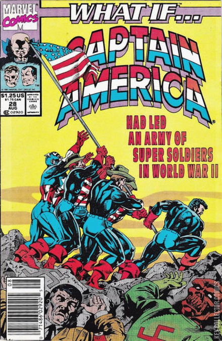 "What If... Captain America Were Not the Only Super Soldier in World War II?" An interview with Ted Koppel and Captain America establishes to the reader the origins of Captain America. Prof. Abraham Erskine created a Super-Soldier serum to give the Allies an edge during World War II. The first test subject is Steve Rogers, a frail 4F recruit willing to die for his country if the experiment fails. To his luck, the experiment was a success, giving Rogers super-human strength, speed and reflexes. However, a Nazi spy, unseen to all, comes out of hiding and assassinates Erskine, who dedicated the secret formula to memory so the Nazis wouldn't steal it. Thus, the serum dies with Erskine, leaving Rogers the only super-soldier during the War. But Uatu the Watcher then explains to the reader the possibility of an alternative universe in which Rogers was not the only Super Soldier during World War II, leading to the same interview, but now Steve Rogers is the President of the United States and out of costume. Rogers explains to Koppel that on the day he gained his powers, his eye caught the Nazi spy entering the room and reacted fast enough to save Erskine from the fatal bullet. As a result, Erskine is able to live on and create more Super-Soldier Serum for soldiers as Steve Rogers continues his campaign to taking down Nazism until he is given orders from higher-ups to join in a secret military attack, forcing Rogers to leave behind Bucky. Because of this, Bucky does not die from the rocket explosion. At a secret army base, Rogers finds an entire army of Super Soldiers, including the likes of Nick Fury, Dum-Dum Dugan, Gabriel Jones and the other Howling Commandos among them. Rogers learns the Army plans to parachute him and all the other Super-Soldiers into the heart of the Nazi Capital of Berlin, expecting on the Germans not expecting the Allies to launch such an attack. Suiting up, Rogers and his Super-Soldier Army parachutes into Berlin and fight through the SS with ease, Cap himself killing The Red Skull before he and his Howling Commandos bust into Hitler's office and arrest him to stand trial, winning the war by 1941. After the attack on Berlin, Captain America and the other Super-Soldiers come across a concentration camp where Cap meets with a young Jew named Magnus, giving him words of kindness that the young Jew takes to heart as he grows up to be the mutant known as Magneto, however, Captain America's words remain with him and he does not seek to destroy humanity. On the way back to America, a stray U-Boat sinks the USS Queen Mary, with Captain America being the only survivor. After receiving a hero's welcome, Rogers is congratulated by President Roosevelt and requests Captain America to head the safety organization Supreme High-Command International Echelon for Liberty and Defense (S.H.E.I.L.D.). Accepting the President's proposition, Captain America reveals his identity and runs SHIELD until he runs for President, winning by a landslide, taking total control of the Super-Soldiers. During Rogers' multiple terms as President, Rogers distributes the Super-Soldier Serum amongst the populace, however, due to a "slight genetic defect," the Serum only works for white, blonde-hair 30-something males. This causes accusation of segregation that causes African American protests, which are put down quickly by the Super-Soldiers and the protestors are rounded up and held in internment camps. Over the decades, events that would create famed heroes are drastically changed. A Super-Soldier security guard near a rocket launch base shoots down four trespassers attempting to fly the rocket into a cosmic storm, their bodies revealed to be Reed Richards, Ben Grimm, Susan and Johnny Storm. As a result, there will be no Fantastic Four. Elsewhere, scientist Bruce Banner begins experiments on gamma radiation, these experiments, however, are banned under the Rogers administration, resulting in Bruce Banner being shot down in his laboratory, ensuring the existence of the Incredible Hulk never comes. Elsewhere, Peter Parker, too young to take the Super-Soldier serum, is bitten by a radioactive spider and gains super-powers, becoming a television sensation. However, upon returning home, Peter finds his Aunt May and Uncle Ben killed. Grieving, Peter is too distraught to pay attention to his Spider-Sense warning as he is shot from behind by Frank Castle, a Super-Soldier under orders by President Rogers to exterminate any threats to the country. Years later, an amnesiac Namor is attacked by Super-Soldiers, forcing him to flee into the ocean where he re-gains his memory and swims back to his underwater kingdom, only to find it completely destroyed by Rogers' Super-Soldiers. Vengeful, Namor flies back to the surface and attacks the Super-Soldiers, bringing them all down. As he wanders the ice lands, Namor comes across a group of Eskimos praising a man trapped in a block of ice. Taking a closer look, Namor realizes the man in the ice is Captain America. The final page asks if this is Captain America, then who is the president? The answers promised in the next story "What if Captain America formed The Avengers?"
