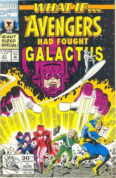 52-page giant. "What If the Avengers Had Fought Galactus?" Script and breakdowns by Jim Valentino, finished art by Sam DeLa Rosa and Russ Sever. Guest starring the Silver Surfer. Brief appearances by the Hulk and Hercules. Cameos by the Fantastic Four, Doctor Doom, and Nick Fury. Two-page back-up story: "What If the Fantastic Four Were Led by Keith Richards Instead of Reed Richards?" Script and pencils by David Cullen, inks by John Lowe. One-page strip: "What If Wolverine Was the Worst There is at What He Does?" Script and pencils by Cullen, inks by Lowe. Valentino/DeLa Rosa cover. Cover is an homage to the cover of Fantastic Four (Marvel, 1961 series) #49 (April 1966)