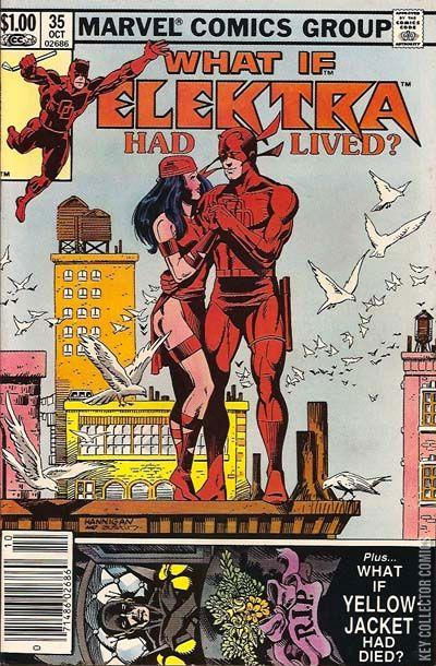 Cover pencils by Ed Hannigan, inks by Terry Austin. "What if Bullseye Had Not Killed Elektra?", script and pencils by Frank Miller, inks by Terry Austin; Bullseye does not kill Elektra and she and Matt go off to find a life for themselves; Daredevil guest stars; Kingpin cameo. "And Thus are Born The Cat People!", script by Roger Stern, art by Steve Ditko; In the Middle Ages, the sorcerer Ebrok created a spell to transform cats into humanoids; When his fellow sorcerers saw them, they became envious and Ebrok was obliged to create more Cat People for them; Later, the sorcerers became alarmed at the rapidly-growing race and banished them to another dimension. "What if: Yellowjacket had Died?", script by Alan Zelenetz, pencils by Greg LaRocque, inks by Mike Esposito and Sal Trapani; Yellowjacket is killed by Elfqueen and Jan leaves the Avengers as a result. Letter to the editor from Diana Schutz (Dark Horse Comics). Letters page letter from Diana Schutz- Future Editor in Chief of Comico
