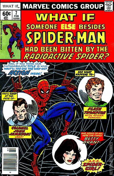 The Watcher presents three alternative realities where in each one of them someone else received the super powers given by the bite of the radioactive spider that would transform Peter Parker in Spider Man.WHAT IF #7 WHAT IF SOMEONE ELSE WAS BITTEN BY THE RADIOACTIVE SPIDERTurning point : Flash Thompson pushes Peter out of the way to show off for his girlfriends, and the spider lands on him. Betty Brant is covering the science exhibit for the bugle and James Jameson is at the Science exhibit and takes Peter Parkers place as the victim of the radio active spider.STORY :Flash Thompson has always wanted to be a hero, when he is bitten he becomes “Captain Spider”. He fights crime, but unfortunately he is not the brain Peter Parker is, and is not able to develop the web fluid.Betty Brant : Her story mimics Peters, but instead of Uncle Bens death inspiring her to continue, it made her want to quit the superhero business.John Jameson : When J Jonah Jameson finds out his son has superpowers, he designs an outfit and has the Bugle support him. Until a fateful mission where John has to save the very capsule he would have been flying if he had not become Spider-man. Note: This issue contains the Hostess Superhero Ad, Thor in "The Ding-A-Ling Family."