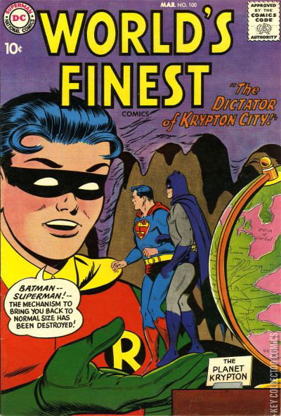 The Dictator of Krypton City (Superman, Batman and Robin vs Lex Luthor : note Krypton city is Kandor / written by Bill Finger) -- 2. Doctor Rocket (gag strip by Henry Boltinoff) -- 3. The Family Favorite! (public service message written by Jack Schiff) -- 4. Mystery of the Vanishing Boys (Tomahawk) -- 5. First Stop the Moon (full text article) -- 6. Case of the Green Error Clown (Green Arrow, Speedy / written by Ed Herron)Robin: Batman-- Superman!-- The mechanism to bring you back to your normal size has been destroyed!