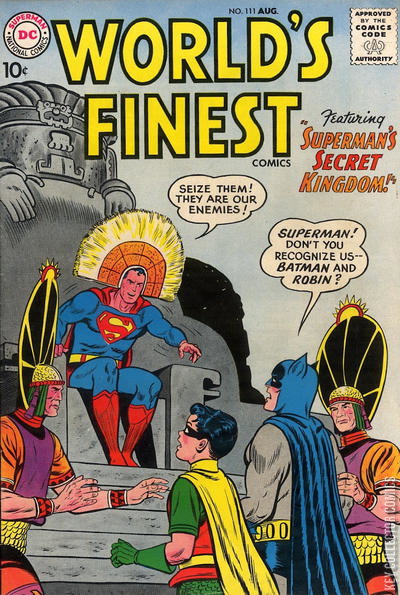 Superman's Secret Kingdom (Superman, Batman and Robin / written by Bill Finger. "Seize them! they are our enemies!" "Superman! Don't you recognize us-- Batman and Robin?") -- 2. Ollie (gag strip by Henry Boltinoff) -- 3. The Hermit of Titan (Tommy Tomorrow, Brent Wood / written by Jack Miller) -- 4. Crisis In the Cockpit (full text story) -- 5. Bebe (gag strip by Henry Boltinoff) -- 6. Lend A Friendly Hand (public service message by Superman / written by Jack Schiff) -- 7. The Crimes Of The Clock King (Green Arrow / written by Ed Herron) The criminal Clock King first appears.