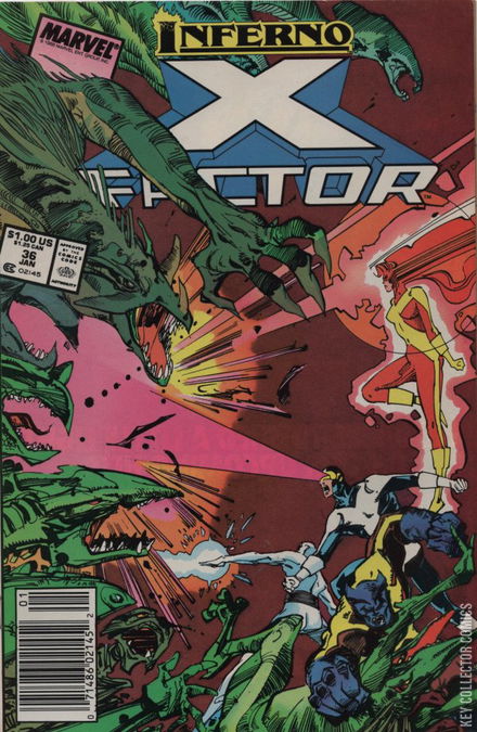"Transformations!" New York City has gone insane, lifeless objects are transforming into demonic creatures and terrorizing the citizens of the city. Beast and Iceman attempt to fight off a transformed hot dog cart and fire hydrant. Witnessing the battle is reporter Trish Tilby, who is put off not by the Beast's restored furry form, but his devil-may care attitude and returned intelligence. Before she can communicate this, a demonically transformed subway train smashes out of the ground and swallows her and her camera crew up before diving back underground again. While elsewhere in the transformed city, the demon N'Astirh prepares for the arrival of the kidnapped baby mutants, particularly the child of Cyclops and Madelyne Pryor, who's sacrifice will smash open the barriers between Earth and Limbo, turning the Earth into a true inferno. As he waits, he considers the fact that Jean Grey and Madelyne Pryor's similar appearances and muses how they are both two sides of the different coin. He turns his attention to Warren Worthington, who is still at the Boston headquarters of the Right, having slain Cameron Hodge and his minions he now cradles the lifeless body of Candy Southern in his arms. When N'Astirh appears to mock him and tells him that he granted Cameron Hodge immortality (although seemingly false) the former Horseman of Apocalypse notices that the demon is projecting his image from New York City. When N'Astirh finishes his communication following the arrival of the mutant babies, Warren vows to hunt down N'Astirh and kill him for his part in Candy's death. Meanwhile, Marvel Girl and Cyclops are flying toward New York City, Jean still psi-linked to young Christopher Summers, she feels the child's pain and fear. Scott tells her to control these powerful emotions so that they can focus on his location and rescue him. While down below the city, the Beast and Iceman board the demonically transformed subway train to try and save the people trapped inside. As it speeds down the subway tunnels of New York, Iceman pulls Trish aside and tells her that Beast is still a great guy and that under his current personality he is still fundimentally the same guy she has begun to have feelings for. While high above the city Cyclops and Marvel Girl notice that some power has transformed the Empire State Building into a giant obelisk that continues to grow. As they witness this they are attacked by a demonically transformed airplane, which Cyclops fights off with his optic blast before they decide to land and try and land to see what's going on. Back aboard the train, Iceman uses his powers to freeze up it's rails as they pass under the Manhattan Bridge. This stops the creature temporarily and allows Iceman and Beast to evacuate the people on board either down to the Circle Line ferry in the East River below or onto the bridge. When the monster subway car breaks free, Trish disobeys Beast's orders to flee so that she can grab a live electrical wire and toss it toward the creature. Seeing what Trish is doing, he dives toward her and pulls her away as the live wire hits the subway train and causes an explosion. The couple make amends of sorts as they flee. As Scott and Jean attempt to land their craft they witness a giant mystical pentagram appear above the city. Their ship is then struck by lightning forcing them to abandon ship. As they pull themselves away telekinetically, they witness in horror as the pentagram turns into a portal and spews forth an army of demons into the city. While elsewhere in the city, Iceman and Beast witness the same thing and Trish tells Beast to go off to save the city, kissing him for good luck. As Cyclops and Marvel Girl defend themselves from the demon horde, they are soon aided not only by the timely arrival of Beast and Iceman, but the Dark Angel as well. Having fought all the demons off, X-Factor is happy to have Warren back in their ranks and after comparing notes they rush off to try and find young Christopher. INFERNO TIE-IN