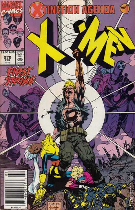 "X-Tinction Agenda Part 1: First Strike" The X-Tinction Agenda begins as the nation of Genosha declares war on the X-Men. Alex Summers leads a team of Magistrates against the New Mutants and the X-Men and take a few hostage. Just when both teams thought they could settle down... Story continues in New Mutants #95. Storm is examined by Forge, but her condition of being stuck in a child’s body seems to be permanent. She renews her deep friendship with Jean Grey, who visits from X-Factor. Later the school is attacked by Genoshan troops and, surprisingly, the missing Havok is with them. Storm realizes that they are outnumbered and taken by surprise, and so she decides to lock the underground complex. By this she dooms herself, Boom-Boom, Rictor, Wolfsbane and Warlock, who are all captured and teleported to Genosha, but she ensures that at least the other halves of the teams remain free to prepare a rescue mission. In Malibu, Lila Cheney teleports back from outer space and mentions that Xavier is in terrible danger before passing out.