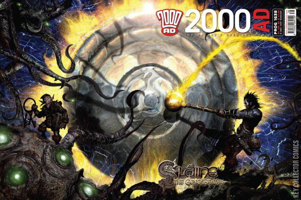 The latest Slaine story comes to an end this Prog. Wraparound cover: Clint Langley (Slaine) Droid Life (Cat Sullivan) Judge Dredd - It Came from Bea Arthur Block (part 2) (Gordon Rennie - P.J. Holden) Zombo (part 7) (Al Ewing - Henry Flint) Slaine The Wanderer - The Gong Beater (part 4 - final part) (Pat Mills - Clint Langley) Cradlegrave (part 6) (John Smith - Edmund Bagwell) Savage - Book Five - 1984 (part 7) (Pat Mills - Patrick Goddard)