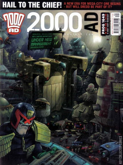 Final episodes for all stories this issue before the fresh start with Prog 1650. Cover: Simon Parr (Pye) (Judge Dredd) Droid Life (Cat Sullivan) Judge Dredd - Under New Management (John Wagner - Carl Critchlow) The Red Seas - The Chimes of Midnight (part 6 - final part) (Ian Edginton - Steve Yeowell) Terror Tales! - Poison (Alec Worley - Ben Willsher) Sinister Dexter - Watch with Motherfunter (Dan Abnett - Anthony Williams/Rob Taylor) Defoe - Book Three - Queen of the Zombies (part 10 - final part) (Pat Mills - Leigh Gallagher)