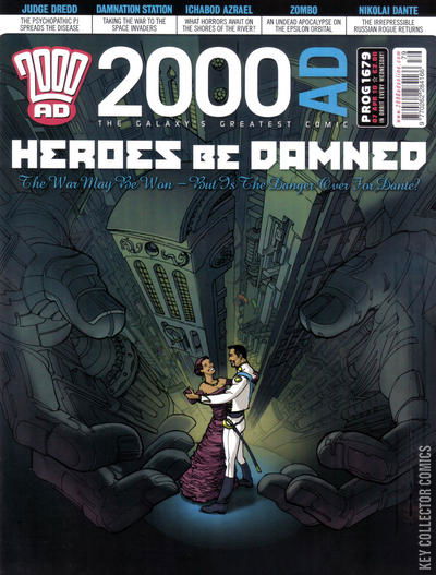 Cover: Simon Fraser (Nikolai Dante) Judge Dredd - Tour of Duty - The Talented Mayor Ambrose (part 6) (John Wagner - Colin Macneil) Damnation Station - To the Dark and Empty Skies (part 3) (Al Ewing - Simon Davis) The Grievous Journey of Ichabod Azrael (and the Dead left in his Wake) (part 3) (Rob Williams - Dom Reardon) Zombo - Zombo's Eleven (part 5) (Al Ewing - Henry Flint) Nikolai Dante - Heroes be Damned (part 1) (Robbie Morrison - Simon Fraser)