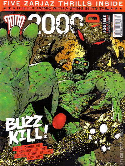 Cover: Henry Flint (Zombo) Judge Dredd - Tour of Duty - The Talented Mayor Ambrose (part 10) (John Wagner - Colin Macneil) Damnation Station - The Sun Always Shines (part 2) (Al Ewing - Boo Cook) The Grievous Journey of Ichabod Azrael (and the Dead left in his Wake) (part 7) (Rob Williams - Dom Reardon) Zombo - Zombo's Eleven (part 9) (Al Ewing - Henry Flint) Nikolai Dante - Heroes be Damned (part 5) (Robbie Morrison - Simon Fraser)