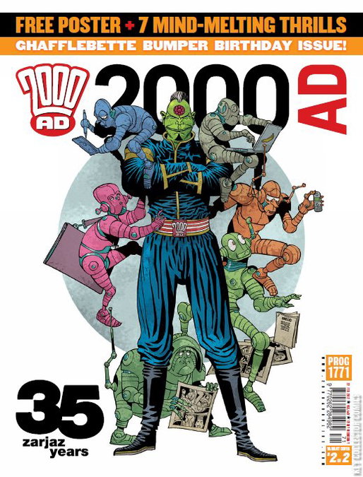 Special birthday issue, celebrating 35 years of thrill-power. An extra length issue (56 pages) with one-off stories (what if...?), centrespread poster and thrills of the future. Also comes with a free gift - large fold-out poster of cover one.Variant cover 1: Chris Weston (the cast of 2000AD)Variant cover 2: Mike McMahon (Tharg and the droids)Judge Dredd - Day of Chaos - Eve of Destruction (part 7) (John Wagner - Ben Willsher)What if...? Gunner Survived the Quartz Zone Massacre (Andy Diggle - Colin Wilson)Nikolai Dante - The Wedding of Jena Makarov (part 9) (Robbie Morrison - Simon Fraser)Judge Dredd starscan (centrespread poster) (art: Jake Lynch)Absalom - Ghosts of London (part 7 - final part) (Gordon Rennie - Tiernen Trevallion)Grey Area - Personal Space (part 1) (Dan Abnett - Lee Carter)What if...? The Visible Man Returned to Earth (Pat Mills - Henry Flint)Strontium Dog - The Life and Death of Johnny Alpha - Chapter Two: The Project (part 9) (John Wagner - Carlos and Hector Ezquerra)