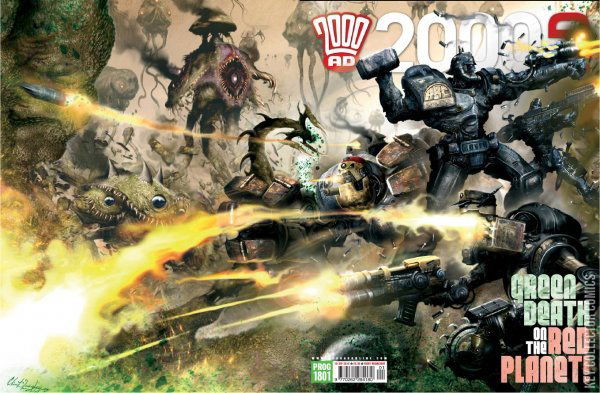 Wraparound cover: Clint Langley (ABC Warriors)Judge Dredd - Payback (part 1) (Michael Carroll - PJ Holden)Brass Sun - The Wheel of Worlds (part 2) (Ian Edginton - I.N.J.Culbard)ABC Warriors - Return to Earth (part 2) (Pat Mills - Clint Langley)Terror Tales - Blackspot (John Smith - Edmund Bagwell)Grey Area - This Island Earth (part 2) (Dan Abnett - Lee Carter)