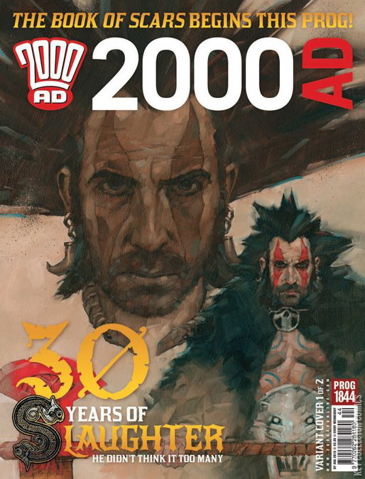 It's Slaine's 30th Anniversary this prog and there are two covers to choose from.Variant cover 1 of 2: Simon Davis (Slaine)Variant cover 2 of 2: Clint Langley (Slaine)Judge Dredd - Scavengers (part 3 - final part) (Rob Williams - Carl Critchlow)Defoe - The Damned (part 9) (Pat Mills - Leigh Gallagher)Slaine - The Book of Scars (part 1) (Pat Mills - Clint Langley)Age of the Wolf III - Wolfworld (part 5) (Alec Worley - Jon Davis-Hunt)The Ten Seconders (book three): Godsend (part 6) (Rob Williams - Edmund Bagwell)