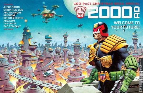 In this bumper 100-page Christmas edition of the Galaxy’s Greatest Comic: Bad Company: First Casualties by Peter Milligan, Rufus Dayglo, Jim McCarthy, Simon Bowland; Judge Dredd: Melt by Rob Williams, Henry Flint, Annie Parkhouse; Strontium Dog: Repo Men by John Wagner, Carlos Ezquerra, Simon Bowland; The Order: In the Court of the WyrmQueene by Kek-W, John Burns, Ellie De Ville; Absalom: Family Snapshots by Gordon Rennie, Tiernen Trevallion, Simon Bowland; ABC Warriors: Return to Ro-Busters by Pat Mills, Clint Langley, Annie Parkhouse; Kingdom: Beast of Eden by Dan Abnett, Richard Elson, Ellie De Ville; Future Shock: The Mighty Mykflex by Martin Feekins, Jesus Redondo, Annie Parkhouse; Sinister Dexter: Blank Ammo by Dan Abnett, Simon Davis, Ellie De Ville.