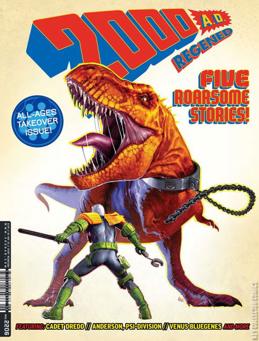 This week's 2000 AD Prog is the fourth Regened prog of 2020. Cadet Dredd is back, courtesy of Mike Carroll and Nicolo Assirelli, and stranded in the dinosaur-infested wilds of the Cursed Earth; fellow Judge Cassandra Anderson also returns, once again by Cavan Scott and Paul Davidson, and tackling an alien menace that is not all it seems; we head to Nu-Earth to meet clone-soldier Venus Bluegenes for the explosive Threat Level: Zero by Liam Johnson and Aneke; and the man with the two-storey brain, Abelard Snazz, returns to 2000 AD after an absence of thirty-seven years, brought to you by Paul Cornell and Anna Readman, who makes her prog debut. Add to that another head-spinning Future Shock from Karl Stock and Tom Newell, and you have a scintillating blast of the sci-fi we've all come to love from 2000 AD.