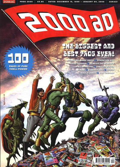First 'Annual Prog' celebrating the best 2000AD talent from the last 22 years. Chronologically, the issue follows prog 1173. The stories continue in the first issue of 2000 (prog 1174). Original Strontium Dog creators (John Wagner and Carlos Ezquerra) reunite for a tale from Johnny Alpha's past, Dave Gibbons returns for a final 'chronological' Rogue Trooper story and Pat Mills writes the very last Nemesis the Warlock adventure (with art from original co-creator Kevin O'Neill). Cover: Brian Bolland (stars of 2000AD) Judge Dredd - Future Crimes (John Wagner - Mike McMahon) Rogue Trooper - Remembrance Day (John Tomlinson - Dave Gibbons) ABC Warriors - Roadkill (Pat Mills - Kevin Walker) Data Bytes - Zenith (art: Steve Yeowell) Nikolai Dante - Love and War (Robbie Morrison - Simon Fraser) Strontium Dog - The Kreeler Conspiracy (part 1) (John Wagner - Carlos Ezquerra) Data Bytes - Bad Company (art: Brett Ewins) Tharg's Thrill Power Death-Match (article) Slaine - Beyond (Pat Mills - Greg Staples) Sinister Dexter - Exit Wounds (Dan Abnett - Simon Davis) Nemesis the Warlock - book ten: The Final Conflict (part 10 - final part) (Pat Mills - Kevin O'Neill) Glimmer Rats (prologue) (Gordon Rennie - Mark Harrison) ABC Warriors poster (art: Ashley Wood) Judge Dredd - Old Pal's Act (Alan Grant - Cam Kennedy)