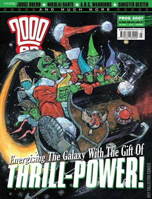 The annual 100-page 'Prog'. Chronologically, this issue follows prog 1517. The stories continue in the first issue of 2007 (prog 1518). Cover: Simon Davis (Tharg the Mighty One) Droid Life (Cat Sullivan) Judge Dredd - Origins (part 14) (John Wagner - Carlos Ezquerra) Stickleback - Mother London (part 1) (Ian Edginton - D'Israeli) Interview - David Bishop Mach 1 Databyte (art: John Cooper) The 86ers - Walking to Eternity (Gordon Rennie - P.J.Holden) Sinister Dexter - Christmas Time (Dan Abnett - Simon Davis) ABC Warriors - The Volgan War - Book One (part 1) (Pat Mills - Clint Langley) Harry Kipling (Deceased) - Winter Wonderbrand (Simon Spurrier - Boo Cook) Kingdom (part 1) (Dan Abnett - Richard Elson) Nikolai Dante - The Road of Bones (Robbie Morrison - John Burns)