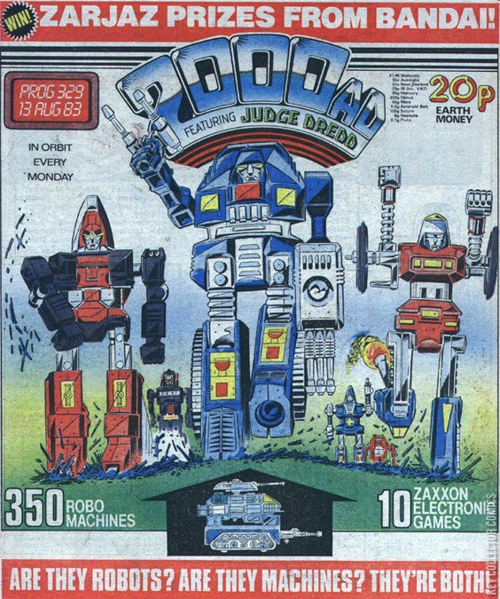 1st cover appearance of the Robo Machines (the Go-Bots) Sam Slade: Robo Hunter - the Slaying of Slade (part 18) (John Wagner and Alan Grant - Ian Gibson) Tharg's Future Shocks - Dad (Alan Moore - Alan Langford) Skizz (part 22) (Alan Moore - Jim Baikie) Judge Dredd - The Weather Man (part 1) (John Wagner and Alan Grant - Ron Smith) Rogue Trooper - Eye of the Traitor (part 3) (Gerry Finley-Day - Cam Kennedy
