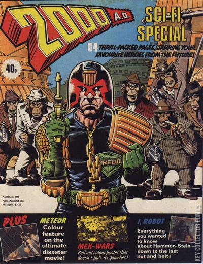 Judge Dredd: The Billion Credit Caper Tharg's Future Shocks: First Encounter & The Last Jungle in the World The Kids from Kosma Strontium Dog: Assault on Trigol 3! M.A.C.H. 1 Dan Dare: The Planet of Frozen Fear + article on Meteor (film).
