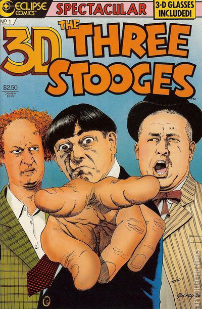 Includes 3-D glasses bound into book. Sometimes called "Eclipse 3-D Special #11." Cover Artist Paul Gulacy, Writer Norman Maurer and an unknown. Artists Norman Maurer, Richard Pine and Joe Kubert. The Three Stooges (Moe Howard, Larry Fine, Curly Howard) star in reprint tales from Three Stooges (1953 St. John) #2: "Men in the Moon"; "The Nightmares of Benedict Bogus"; "Pie-Rates' Reward"; and "Two Drips and a Droop"! (Note: Shemp redrawn as Curly in this issue by Richard Pine.) And also from Three Stooges (1953 St. John) #2: An untitled Stunt Girl story drawn by Joe Kubert. B&W with 3-D effect red and blue on standard paper with a $2.50 Cover price.
