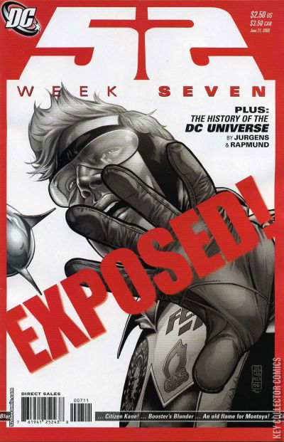 "GOING DOWN" / THE HISTORY OF THE DCU: PART VI OF X Booster Gold sells out in WEEK 7, illustrated by Ken Lashley & KWL Designs! But he's sure to see the same people on the way down that he met on the way up! Plus, "The History of the DC Universe," backup feature continues each week by Dan Jurgens and Art Thibert! 52: A year without Superman; a year without Batman; a year without Wonder Woman...but not a year without heroes.