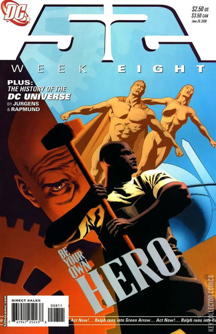In WEEK 5, illustrated by Chris Batista & Jimmy Palmiotti, It's a mystery in space and a surprise so unexpected that even the cover is top secret! WEEK 6, with art by Joe Bennett & Ruy Jose, features the debut of some major players, as Green Lantern discovers the world's newest sensations: China's own super-hero team! Booster Gold sells out in WEEK 7, illustrated by Ken Lashley & KWL Designs! But he's sure to see the same people on the way down that he met on the way up! And WEEK 8, with art by Eddy Barrows & Rob Stull, puts the spotlight on John Henry Irons...Man of Steel! With Superman gone, can he stop the never-ending schemes of Lex Luthor? Plus, "The History of the DC Universe," backup feature continues each week by Dan Jurgens and Art Thibert! 52: A year without Superman; a year without Batman; a year without Wonder Woman...but not a year without heroes.