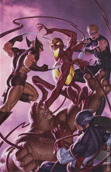 CAPTAIN AMERICA! HAWKEYE! THE THING! WOLVERINE! Years ago, Cletus Kasady used the Carnage symbiote to take over a small town called Doverton, Colorado, as well as the team of Avengers who arrived to stop him! Barely able to free themselves from his control during their first meeting, this small band of heroes will have no choice but to assemble once more after they discover that Doverton’s entire population has recently fallen victim to Carnage’s more lethal designs…