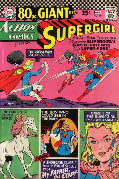 THE BOY WHO COULD SEE IN THE DARK Supergirl rescues a boy with amnesia found lost at sea. He stays at the orphanage until Linda can figure out where he's really from; She learns that he is a prince from the planet Korvia who is fleeing prosecution for a crime he didn't commit. MY FATHER, THE COP! Linda has to scheme to prevent herself from being adopted to protect her secret identity; she spends 30 days with the Wilkins. Mr. Wilkins is a policeman. THE SON OF BIZARRO - PART 1 Bizarro-Lois gives birth to Bizarro-Jr. No. 1 who, while he thinks like a Bizarro looks like Superman when he was Superbaby. THE ORPHAN BIZARRO! - PART 2 THE BIZARRO SUPERGIRL - PART 3 SUPERGIRL'S SUPER-BOY FRIENDS! THE SECRET ORIGIN OF SUPERGIRL'S SUPER-HORSE!