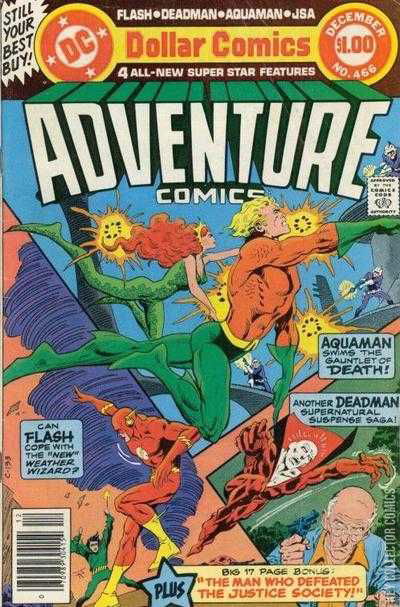 THE CLOUD WITH THE LEATHAL LINING! The Flash must learn the cause of the Weather Wizard's inexplicably benevolent behavior. NEVER SAY DIE! Deadman inhabits the body of a pigeon to keep Abraham Gold from shooting himself. He is depressed because his son Jacob makes a living pushing drugs for mobster Mr. Caprice. THE DEFEAT OF THE JUSTICE SOCIETY! The Huntress tells Power Girl the story of how the Justice Society originally disbanded in 1951 when they were asked to reveal their true identities before a Congressional hearing committee, and refused. DEATH ON ICE! Aquaman is decoyed by a clone-Mera into a trap set by the Antarctic Nazis, during which he discovers Helga is still alive, only a clone of herself having been killed earlier.
